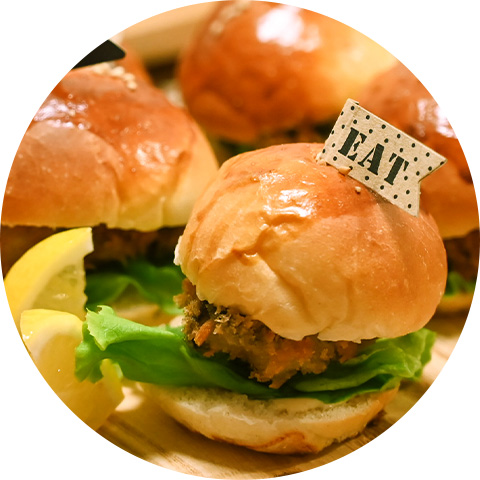 アレンジでひとくちパンに挟んで牡蠣フライバーガーにするのもおすすめ!見た目がかわいらしくおうちパーティーにぴったりなお料理に変身します◎